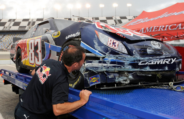 Denny Hamlin's crew checks out the remains of his primary Daytona 400 car (Photo: Getty Images for NASCAR)