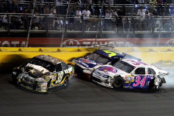 Mark Martin (5) gets squeezed up into the wall by David Gilliland (34), and Ryan Newman (39) has no place to go (Photo: Getty Images for NASCAR)