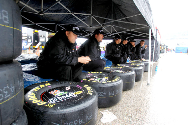 A cold north Texas rain keeps Mark Martin's Sprint Cup crew bundled up and under cover Sunday. (Photo: Getty Images for NASCAR)