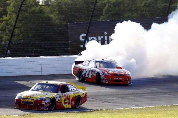 Joey Logano spins after tangling with Kevin Harvick...an incident which NASCAR officials talked over with the two after the race (Photo: Getty Images for NASCAR)