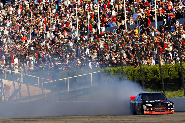 Winner Denny Hamlin does a smokey burnout after his fourth win of the season...and drew a short rebuke from his team after smacking the wall in celebration (Photo: Getty Images for NASCAR)
