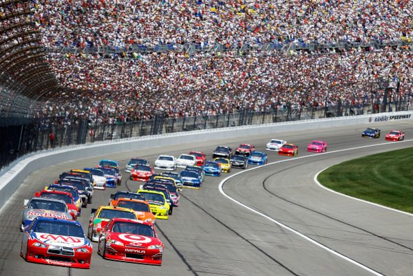 Kurt Busch (outside) at the front for the start of the Kansas 400, and he stayed right there most of the day (Photo: Getty Images for NASCAR)
