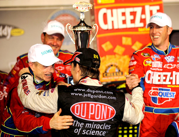 Southern 500 winner Mark Martin (L) gets congrats from teammate Jeff Gordon, as crew chief Alan Gustafson looks on (Photo: Getty Images for NASCAR)