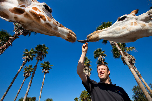 You think it's easy being a NASCAR driver? Hey, how do you feed a giraffe? How tall is that ladder, Matt? (Photo: Getty Images for NASCAR)