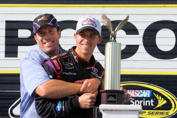 Team manager J. D. Gibbs (L) plays with Monday winner Denny Hamlin, Gibbs' third winning driver this season (Photo:Getty Images for NASCAR)