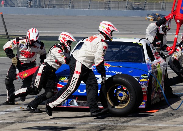 Oops, should have just taken two. Greg Biffle pit stop late in the Kansas 400 (Photo: Getty Images for NASCAR)
