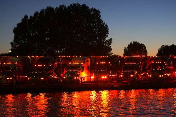 NASCAR's haulers lining up at sunset for the run back to North Carolina, 1,000 miles to the south (Photo: Getty Images for NASCAR)