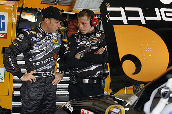 Daytona 500 winners Matt Kenseth and crew chief Drew Blickensderfer discuss strategy for Sunday's Auto Club 500 at Auto Club Speedway. (Photo Credit: Jason Smith/Getty Images)