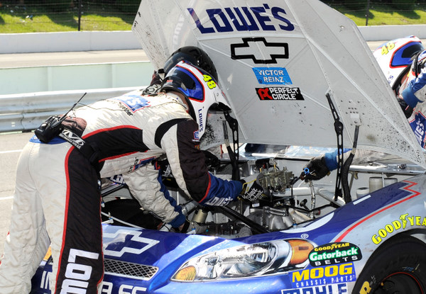 When the hood goes up, it's not a good sign. But Dr. Chad Knaus found just the right cure for Jimmie Johnson's ills (Photo: Getty Images for NASCAR)