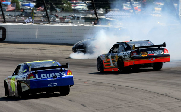 Yes, Jimmie Johnson had a remarkably charmed Monday....and he had to work like hell for it too, like here, when Robby Gordon crashed (Photo: Getty Images for NASCAR)