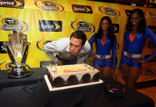 Jimmie Johnson gets a birthday cake and small party, courtesy of NASCAR, during Thursday's New York City PR whirlwind....but Juan Pablo Montoya, who is also celebrating a birthday (Sunday, also turning 34), didn't get anything. A PR faux pas? It would seem. (Photo: Getty Images for NASCAR)