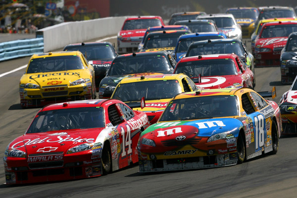 Tony Stewart (14) spotted Kyle Busch (18) the lead late, and then passed him on the right, and then passed him on the left...(Photo: Getty Images for NASCAR)