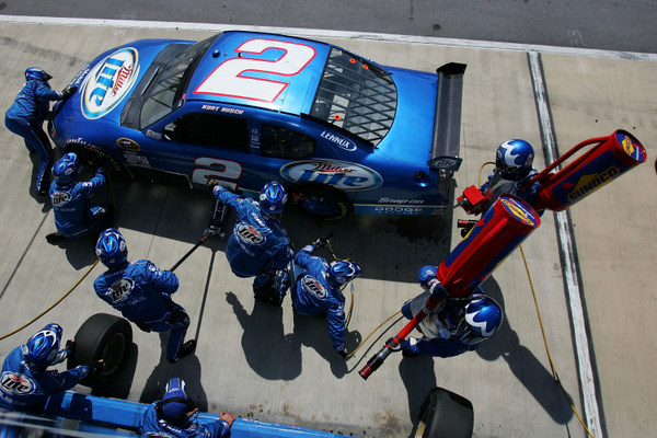 Kurt Busch made one of the day's great saves when he got out of shape on the trioval and spun wildly but hung on and recovered. He even wound up in the lead with 130 miles to go, with a gas-only pit stop call by Tryson.