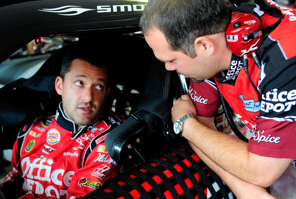 Tony Stewart talking with crew chief Darien Grubb (Photo: Getty Images for NASCAR)